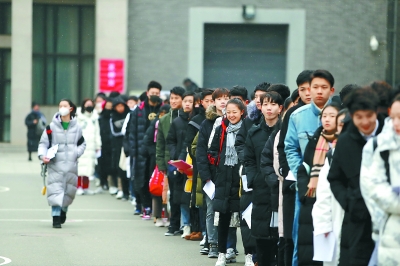 早上8點,京城飄起了雪花,位于南鑼鼓巷的中戲東城校區前,等待入場的考生已經排起幾十米的長隊。今天是正月初八,年味兒還未退去,不少考生告訴記者,這個春節假期他們選擇了在京備考過年。在候考教室,記者見到了來自山東的考生王佳吻,她正手捧材料,認真準備著朗誦篇目,一首現代詩《紙船——寄母親》。小王告訴記者,為了實現自己的表演夢想,她已經兩年沒有回家過年了,準備這首詩是想表達自己對家的思念,也希望這份思鄉之情能帶給自己好運。
