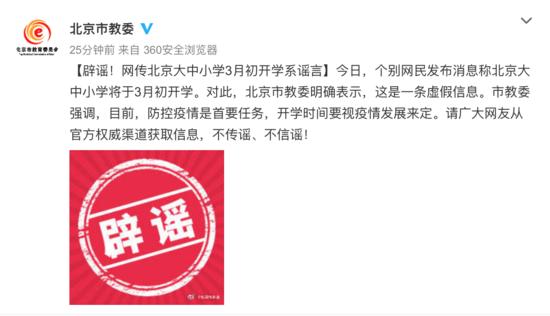 人民網北京2月19日電(李依環)據北京市教育委員會官方微博消息,今日,個別網民發布消息稱北京大中小學將于3月初開學。對此,北京市教委明確表示,這是一條虛假信息。北京市教委強調,目前,防控疫情是首要任務,開學時間要視疫情發展來定。請廣大網友從官方權威渠道獲取信息,不傳謠、不信謠。