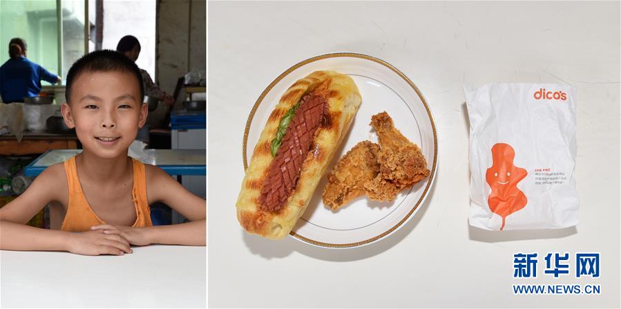 拼版照片:在四川省巴中市南江縣八廟鎮,今年8歲的馮可家準備吃由姐姐從縣城買來的快餐——火腿腸面包和炸雞翅。臨近開學,在河北上大學的姐姐即將返校,她臨走前為弟弟馮可家準備了他最愛吃的午餐。2016年8月21日。新華社記者劉坤攝