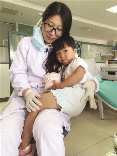 “別哭,奶奶抱!”就在這時,囗腔診室主任醫師孔銳伸出了雙臂,溫柔地招呼她走過來。同時孔主任從桌上拿了一個牙齒模型玩具遞到她的手中,并趕緊解開了口罩,讓小女孩看見她慈愛的表情,親切地笑著再次向她伸出雙臂。
