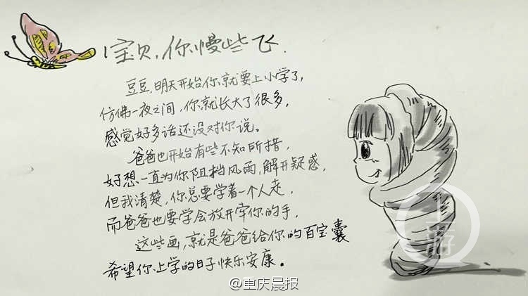 “豆豆,明天開始你就要上小學了,仿佛一夜之間,你就長大了很多……這些畫,就是爸爸給你的百寶囊……”重慶6歲女孩豆豆該上小學了,豆豆爸用一組“滿滿都是愛”的手繪圖,畫出了對女兒的叮囑和期望。網(wǎng)友:好暖,別人家的爸爸……