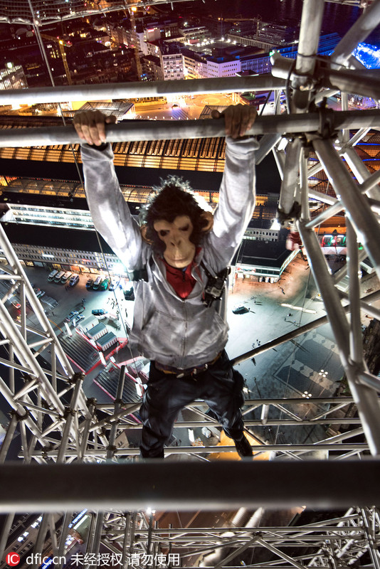 2016年4月21日報道(具體拍攝時間不詳),德國科隆,這些令人心跳加速的照片顯示,一名男子懸蕩在科隆一座大教堂的邊緣。同樣膽大的攝影師Flavius Vesely為他的面具朋友Flavius拍攝下了這些驚險的照片。其中一張顯示Flavius戴著猴子面具懸掛在環繞教堂的腳手架上,看上去令人心驚肉跳。Flavius來自德國卡塞爾,是“視覺仇敵'組織的一名成員(Visual Enemies),該組織是一個城市團體,由攀爬者和攝影師組成。Flavius Vesely/東方IC