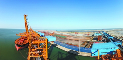 河北港口集團滄州黃驊港礦石港務有限公司20萬噸級礦石碼頭是河北省南部沿海地區大型專業化碼頭,碼頭規劃四個泊位,先期建設兩個,年設計通過能力3000萬噸。圖為碼頭正在進行礦石卸船作業。許金廣攝
