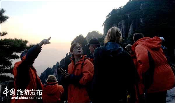 每年黃山吸引了大批外國游客前來旅游觀光。8月28日,8位澳大利亞游客在黃山風(fēng)景區(qū)排云亭處觀賞美景,不停拍照,同伴之間還不時將在黃山拍出來的美景進(jìn)行分享。(王輝 文/圖)