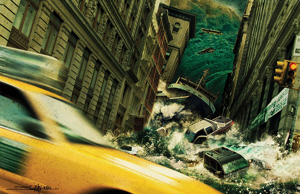 國際在線專稿:據英國《每日郵報》12月23日報道,加拿大藝術家史蒂夫·麥吉近日發布許多自己創作的世界末日圖,幾乎包括了每種導致世界被終結的可能情況,比如大洪水、超級地震等。此外,還有飛機墜毀在紐約市中心、悉尼港出現黑洞、法國海岸大規模漏油等場景。