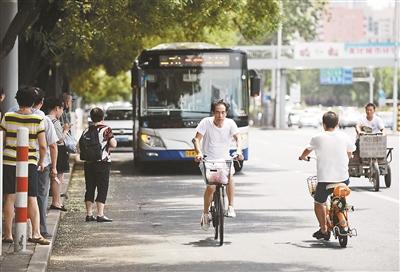 在道路兩側,防護欄把機動車道與非機動車道分隔開,電動車和自行車在非機動車道上有序地行駛。但是到了公交車站臺的地段沒有了防護欄,機動車道與非機動車道的隔離帶只剩下一條地上的白線,白線外側的區域既是公交車站的區域也是非機動車道的區域。