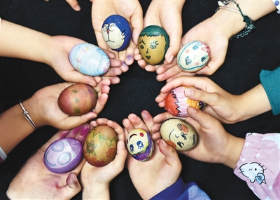 圖為今年5月5日立夏,安徽省合肥市香樟雅苑小學學生在展示自己手繪的彩蛋。