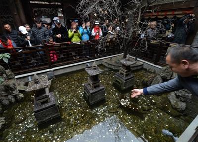 中午時分,記者又一次仔細觀察了水池,在游人拋投硬幣時,確實有一兩條金色的觀賞魚在石縫處游動著。在木制欄桿四周,正貼著“禁止倚靠欄桿”、“禁止投幣”等字樣。“春節游客爆滿,水池是從寬巷子到窄巷子的必經之道,加上很多人在拋硬幣,頓時人滿為患。我們只好打印了幾張提醒張貼起來。”辦公室工作人員還表示,“等春節游客潮稍微退卻,天氣回暖,我們就要派人下水打撈這些硬幣,用于景點建設。”