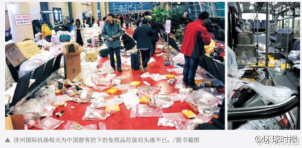 《朝鮮日報》稱,據說當天國際線僅在候機室里就產生了能裝滿100多個100升容量垃圾袋的垃圾。中國游客離開后,3名環境美化員滿頭大汗地清理。此外,一些中國游客在擺渡大巴里也亂扔垃圾。