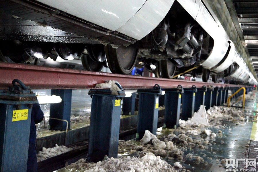 北京鐵路局動車段配屬動車組車底結(jié)冰情況。(央廣網(wǎng)發(fā) 李博攝) -