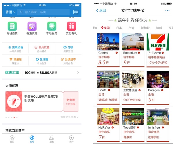 比如,在港澳臺,打開支付寶“發現”,你可以找到屈臣氏、豐澤電器、瑞士雷達表、長板壽司的5折優惠券;在日本,可以找到唐吉坷德滿3萬日元立減2000的優惠;新加坡可以找到4折的名勝世界演出票等等。使用時也很方便,領取后只要打開優惠券,點擊付款就能安優惠價掃碼付款。