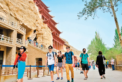 進(jìn)入火熱的7月,敦煌旅游持續(xù)升溫。被譽(yù)為沙漠中美術(shù)館的世界文化遺產(chǎn)——敦煌莫高窟,游客超過(guò)了每日限額。圖為游客在敦煌莫高窟觀光游覽。