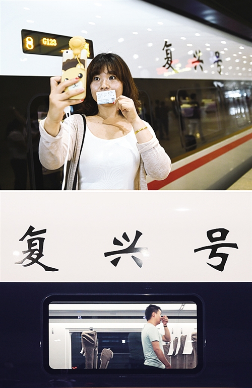 上圖:一位乘坐“復興號”G123次列車的乘客在北京南站車外與列車合影。新華社記者 鞠煥宗攝 下圖:乘客在上海虹橋火車站“復興號”G124次列車內行走。新華社記者 丁 汀攝