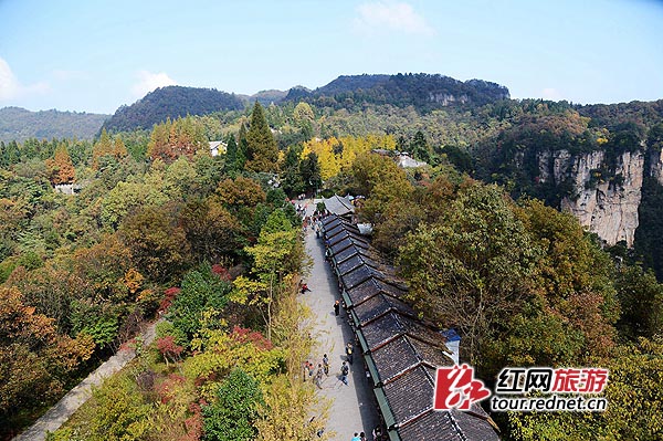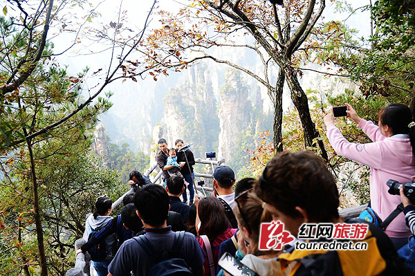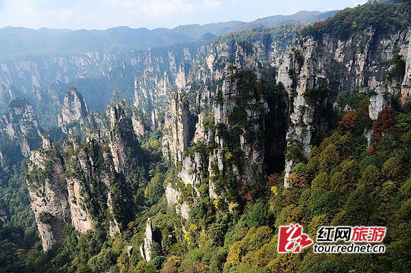 紅網時刻10月30日訊(通訊員 鄧道理)金秋武陵源,美景惹人羨。十月將盡。世界自然遺產地張家界武陵源風景名勝區天子山、袁家界、黃石寨一帶深秋風景異常迷人,紅的、黃的、紫的、綠的樹葉把一座座山峰裝扮得五彩斑斕,恍若童話世界,令海內外游客陶醉忘返。