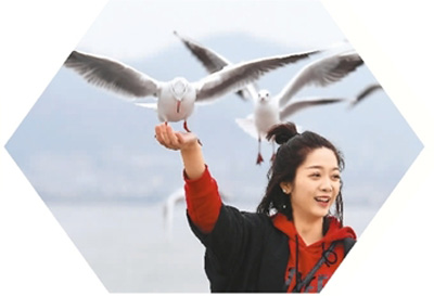 1月10日,一名女孩在云南省昆明市滇池大壩與紅嘴鷗合影。