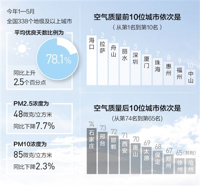 生態(tài)環(huán)境部日前發(fā)布今年前5月全國城市空氣質(zhì)量狀況,1—5月,全國338個地級及以上城市平均優(yōu)良天數(shù)比例為78.1%,同比上升2.5個百分點。PM2.5濃度為48微克/立方米,同比下降7.7%;PM10濃度為85微克/立方米,同比下降2.3%。