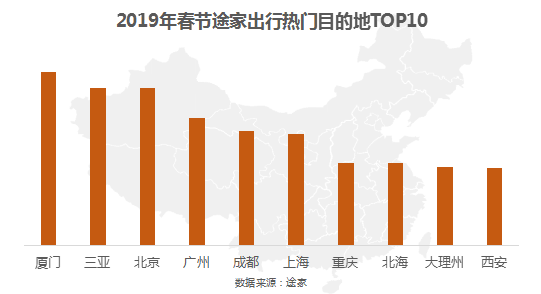 2019年春節(jié)期間,途家平臺(tái)TOP10國(guó)內(nèi)熱門出行目的地依次為:廈門、三亞、北京、廣州、成都、上海、重慶、北海、大理州、西安。不難發(fā)現(xiàn),除北京和西安外,其余均為南方城市。春季南方氣候溫暖舒適,適合游玩,尤其是廈門和三亞這樣氣候適宜的海邊城市,民宿房源豐富且發(fā)展比較完善,因此成為春節(jié)期間熱門目的地。