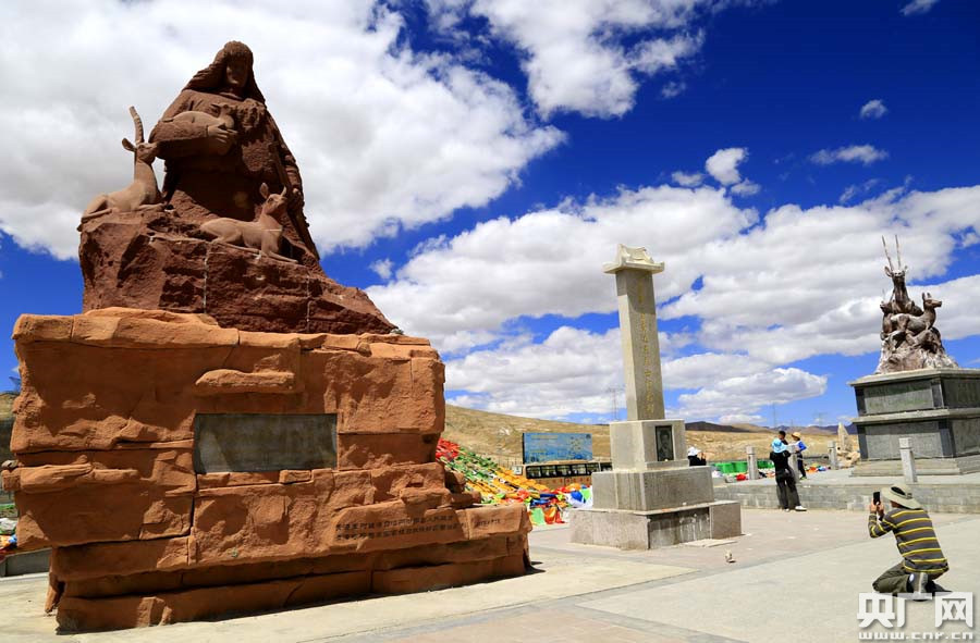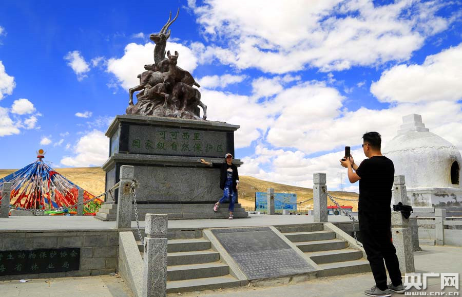 游客在昆侖山口的可可西里自然保護區藏羚羊雕塑前留影(央廣網記者 張雷 攝)