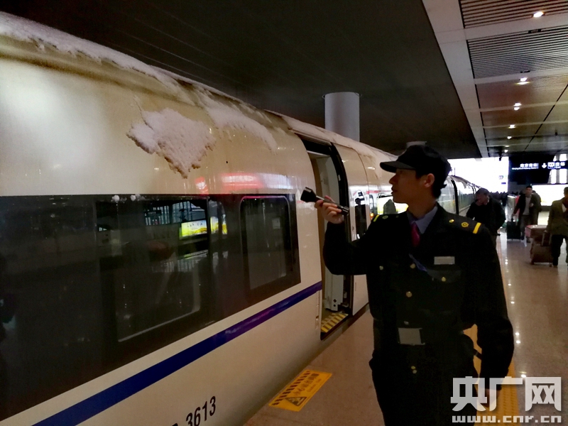 2018年1月4日,中國鐵路上海局集團公司南京動車段隨車機械師對動車組列車加強站臺檢查,確保雨雪天氣中動車組安全運行。(央廣網發 謝冰飛攝) -