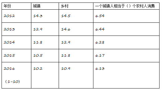 2012年一個城鎮人消費相當于6.54個農村人消費,5年來這一比例在縮小,到2016年為6.13個農村人消費,但是仍然沒有突破6的距離。