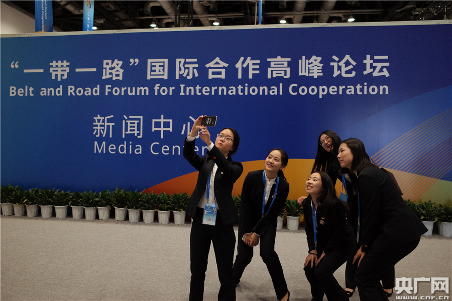 在“一帶一路”國際合作高峰論壇新聞中心內,工作人員們紛紛合影留念。(央廣網記者 王永康 攝) -