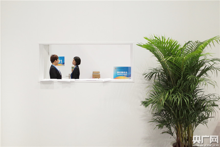 在“一帶一路”國際合作高峰論壇新聞中心內,兩名工作人員在預訂服務臺窗口交流工作。(央廣網記者 王永康 攝) -