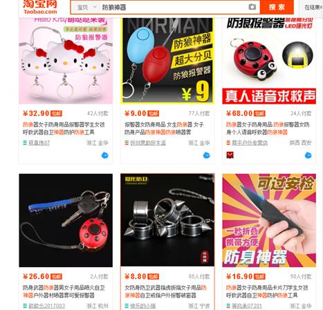 記者在淘寶上鍵入“防狼神器”一詞,除了防狼噴霧、噴火防狼神器之外,銷量在前幾位的還有防狼戒指、強(qiáng)光手電等。除上述提到的具有一定攻擊性的武器,如防狼噴霧、袖珍短棍、防狼筆等。記者注意到,網(wǎng)上出售的防狼工具,大多小巧便攜,攻擊性小,傾向于防護(hù)。