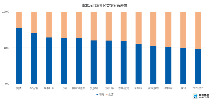 此外,從南北方景區(qū)出游類型分布差異上看,十一黃金周期間預計南方的出游用戶比例將高于北方,其中受溫度影響,海灘游南方將明顯高于北方,而在世界遺產、教堂類景區(qū)的出游占比上,北方則偏高于南方。