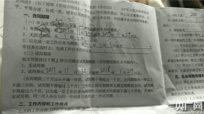 根據趙程提供的勞務合同照片,記者看到合同期限一欄明確寫有“有固定期限:從2017年11月30日起至2019年11月29日止。試用期限從2017年11月30日到起至2018年1月29日止。”