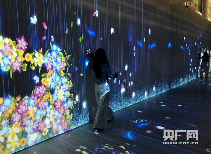 在沉浸式VR體驗區,工作人員觸摸屏幕,指尖便開出姹紫嫣紅的花朵。