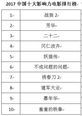 通過評審團投票,2017年度中國電影、電視劇影響力排行榜如下: