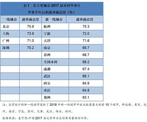 記者還注意到,近五屆大學畢業生就業滿意度持續上升,共上升11個百分點。從不同城市來看,北京是“北上廣深”四個一線城市中就業滿意度最高城市,杭州是新一線城市中就業滿意度最高城市。
