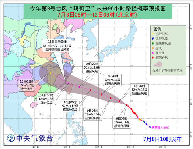 今年第8號臺風(fēng)“瑪莉亞”未來96小時路徑概率預(yù)報圖(圖片來源:中國氣象報社)