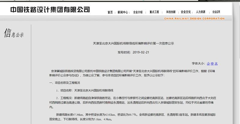 近日,天津至北京大興國際機場聯絡線環境影響評價首次信息公示(中國鐵路設計集團有限公司官網截圖)
