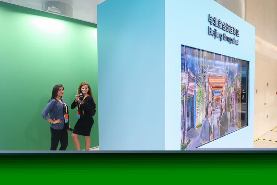 步入式合影互動區通過將參與者與背景景象的互動進行拍攝并合成,實現參與者與鳥巢、敦煌莫高窟等中國著名標志性建筑合影的效果,拍攝的圖片可以現場打印。
