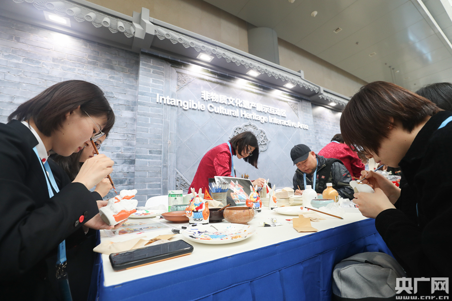 非物質文化遺產互動區邀請4組北京的非物質文化遺產傳承人,為媒體記者進行傳統國畫、傳統攢玉石宮花、兔爺彩繪、軟陶工藝制作等表演,中外媒體記者可親身體驗非遺制作,深入了解北京特色傳統文化。
