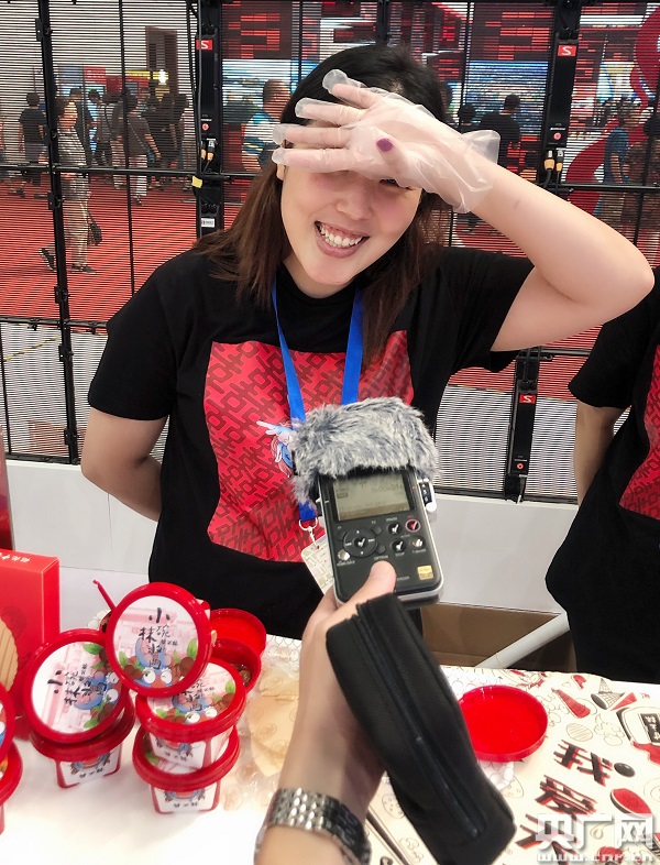 王沫華(左一)展示參展商品(中央廣播電視總臺央廣記者 李展鴻 攝)