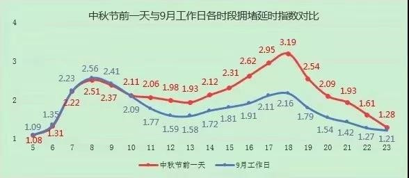 從時間上看,今年中秋假期出京方向擁堵時段集中出現在假期首日10時至12時;返京車流相對分散,基本出現在最后一天下午到傍晚時段。