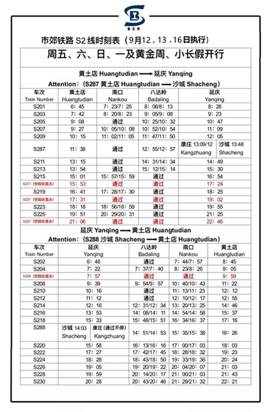 9月14日至9月15日,根據鐵路運輸調整需要,S2線及懷柔-密云線部分列車停運。
