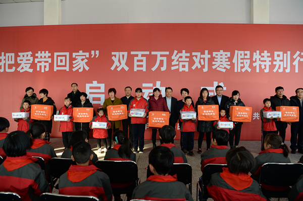 “全面小康路上一個(gè)不能少,保障所有孩子特別是貧困地區(qū)兒童、困境兒童都能健康成長(zhǎng)是全面小康的題中之義。”全國(guó)婦聯(lián)主席沈躍躍在出席活動(dòng)時(shí)指出,在總結(jié)今年暑期多部門(mén)共同開(kāi)展關(guān)愛(ài)兒童、服務(wù)社會(huì)活動(dòng)的基礎(chǔ)上,全國(guó)婦聯(lián)面向貧困地區(qū)兒童,繼續(xù)共同開(kāi)展“把愛(ài)帶回家”雙百萬(wàn)結(jié)對(duì)寒假特別行動(dòng)。屆時(shí),全國(guó)婦聯(lián)、教育部、民政部等7部門(mén)將在寒假期間組織一百萬(wàn)名各類(lèi)志愿者,與一百萬(wàn)名留守兒童、困境兒童結(jié)對(duì),突出“團(tuán)圓”“幸福”“愛(ài)”等新年特色,通過(guò)開(kāi)展“把優(yōu)良家風(fēng)帶回家”“把法治安全帶回家”“把社會(huì)關(guān)愛(ài)帶回家”三項(xiàng)活動(dòng),讓留守兒童和困境兒童在享受親情陪伴中度過(guò)美好假期。
