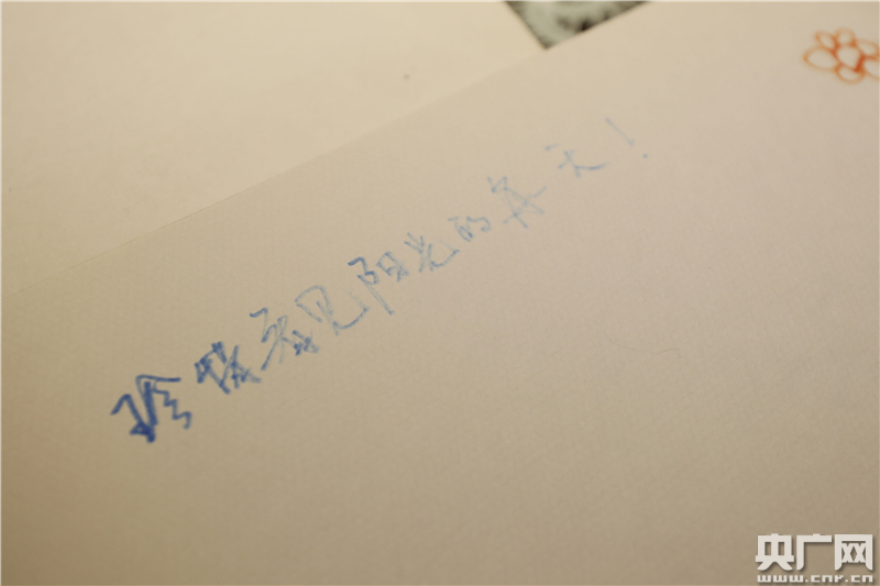 讓不少人印象深刻的,是一對母子留下的繪畫留言。剛上小學一年級的女兒說:“媽媽,好黑呀!”媽媽安慰她道:“寶貝,要堅持!”旁白寫下一句“黑暗的盡頭是光明!”