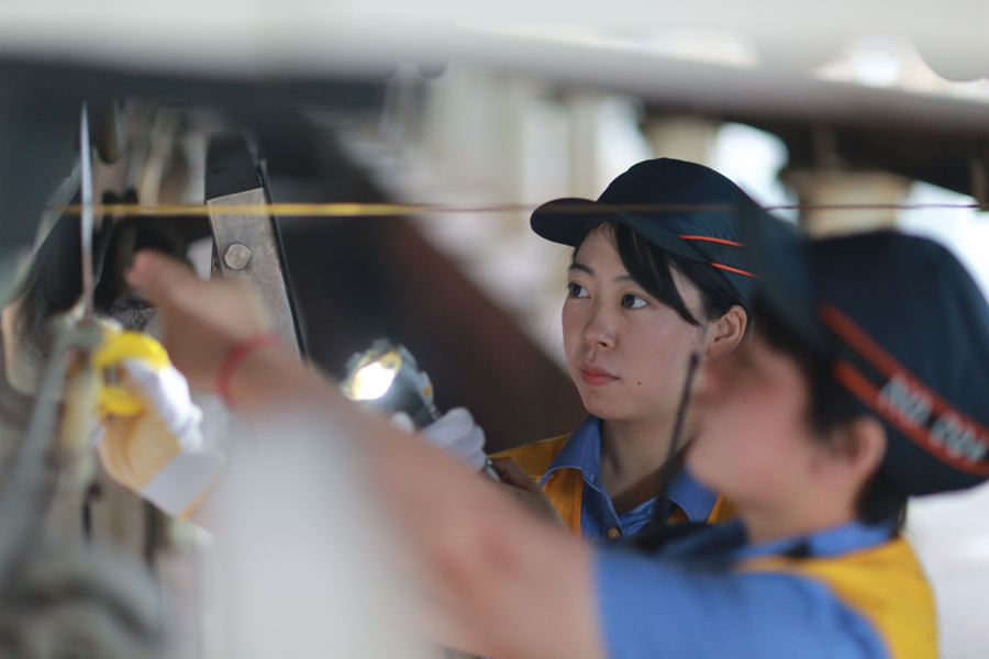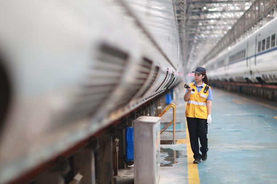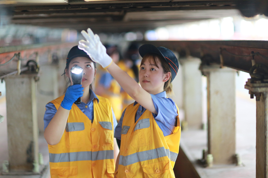 7月進入暑運以來,該工區異常忙碌,平均年齡只有27歲的女子檢測組隊員定期對車載設備進行出庫前的精檢細修,確保動車組安全運行。