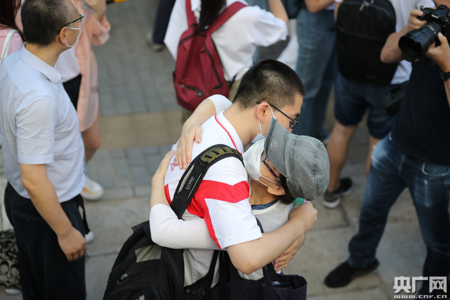 7月7日,中國人民大學附屬中學考點,一名考生進入考場前與家長擁抱(央廣網記者 韓靖 攝)