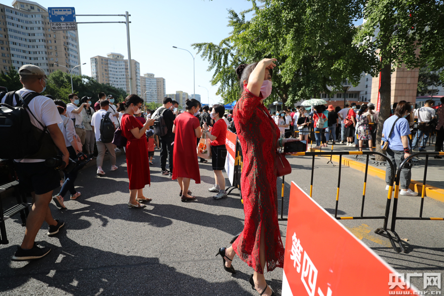 7月7日,中國人民大學附屬中學考點,身穿旗袍的家長前來送考(央廣網記者 韓靖 攝)