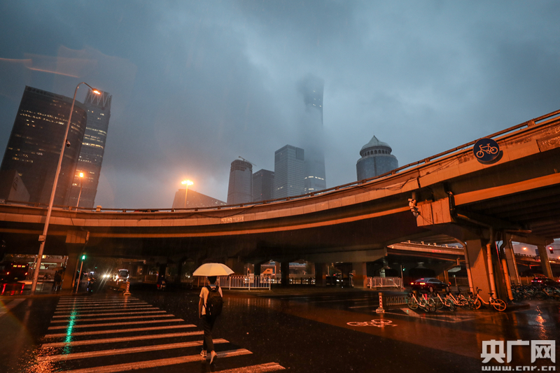 18時30分左右,北京國貿附近開始新一輪降雨,大雨正逢北京下班“晚高峰”,市民下班在雨中趕路。