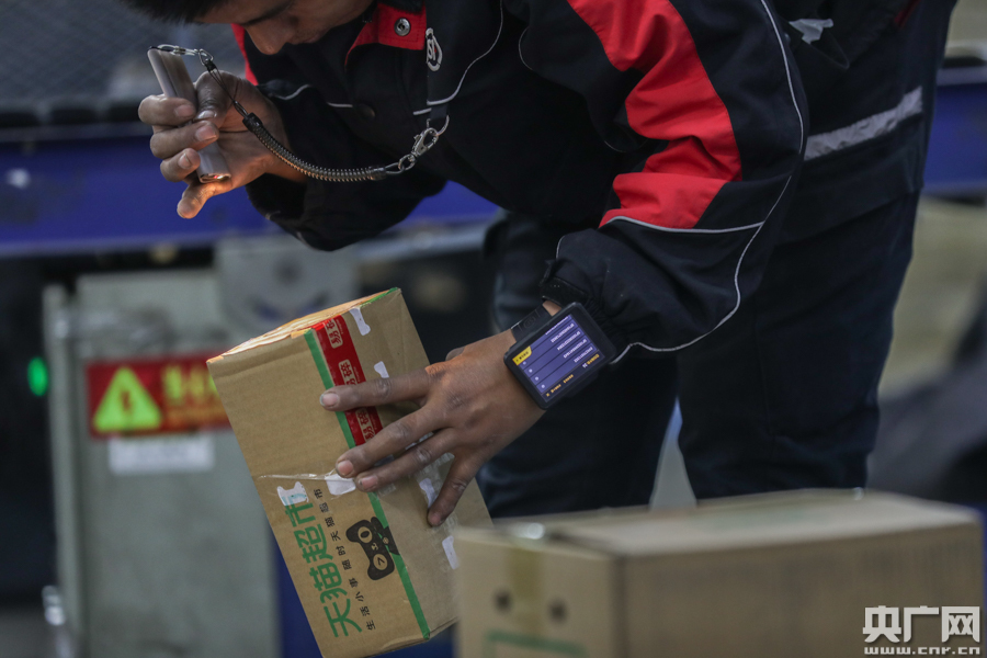 快遞員的新式穿戴設備可以有效提高工作效率(央廣網記者 韓靖 攝)