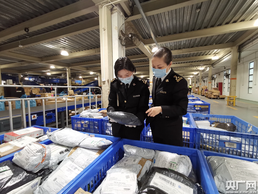 楊劍(右)在監(jiān)管現(xiàn)場調研包裹通關情況(央廣網(wǎng)發(fā))