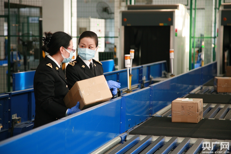 2020年2月20日楊劍(右)在郵遞物品監(jiān)管現(xiàn)場指導防疫物資通關(央廣網(wǎng)發(fā) 李勇 攝)