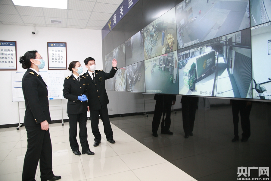 楊劍(左二)在監(jiān)控指揮中心查看郵包通關情況(央廣網(wǎng)發(fā))