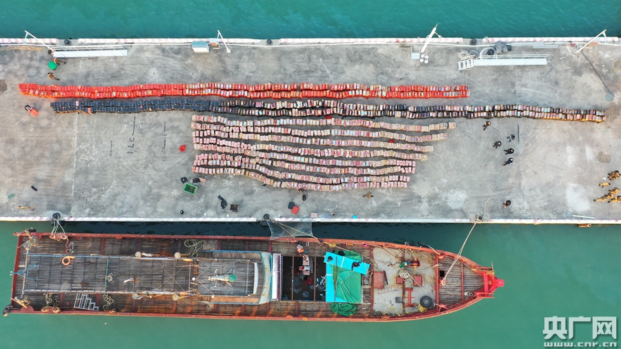 查獲的嫌疑船只與走私香煙(央廣網發 通訊員供圖)